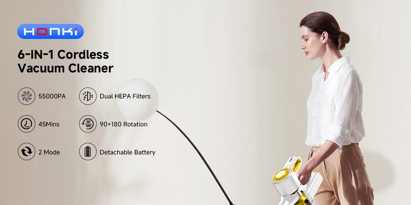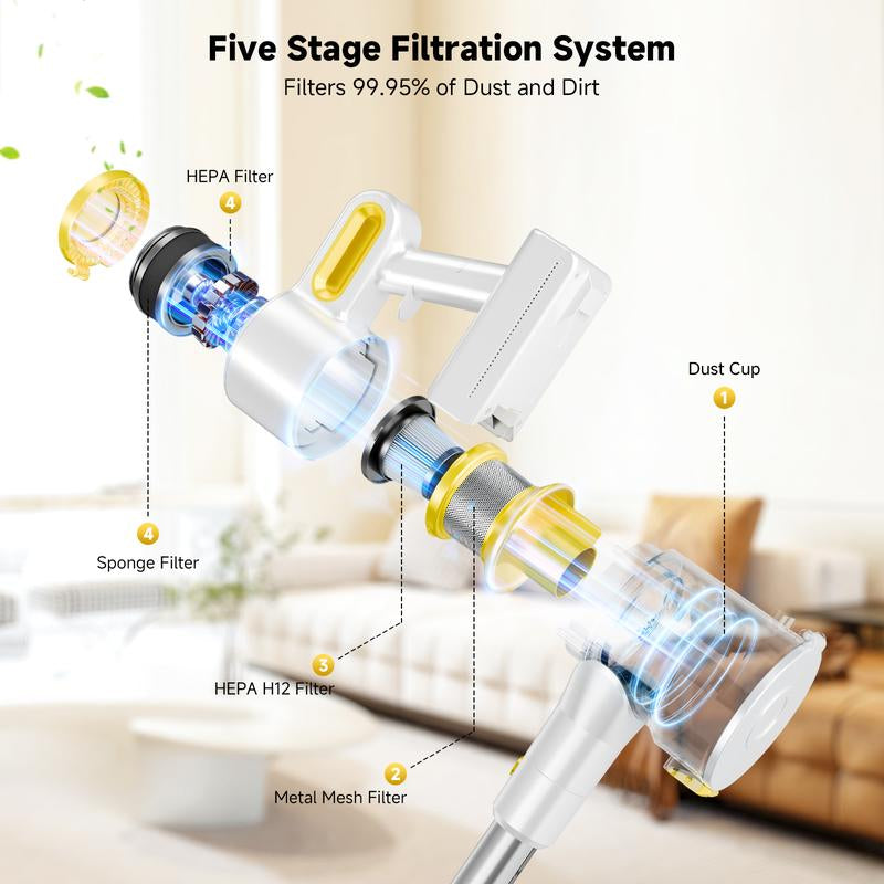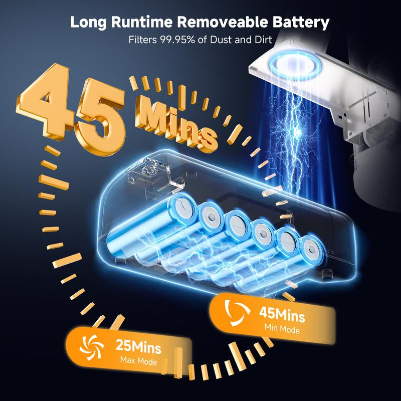 The Cordless Vacuum Cleaner for Home delivers 45KPA suction power, making it a robust choice for home cleaning. It features a 6-in-1 stick design, ideal for various surfaces like hardwood floors and carpets. This lightweight vacuum cleaner offers a 40-minute runtime, ensuring extended cleaning capabilities without frequent recharging. Perfect as a robot vacuum cleaner alternative, it handles pet hair efficiently.